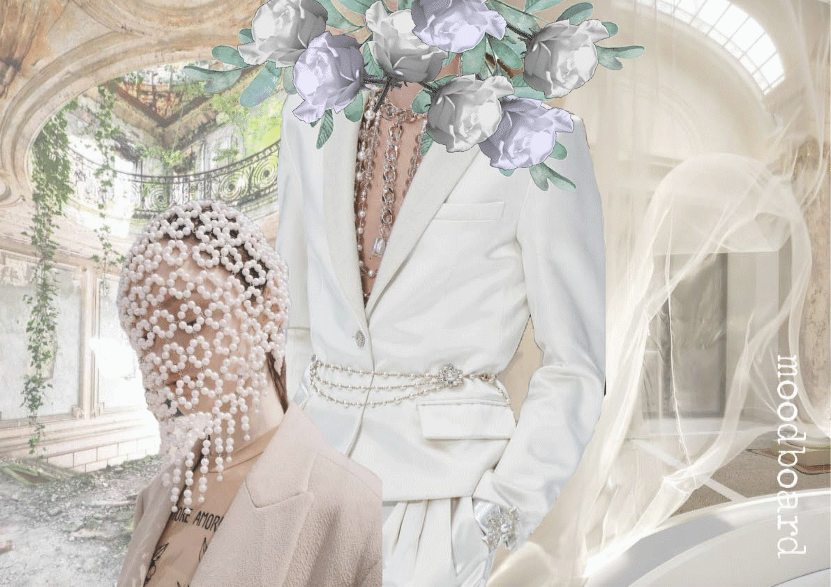 My moodboard shows both the ethereal feeling and the movement of the fabric captured within this collection. It also depicts the design style, with structured blazers and coats, as well how it would be paired with the jewellery. The soft lighting and colouring also matches the mood of my final collection. The combination of structural elements combined with nature shows the contrasting ideas displayed within my garments and fabric choices.